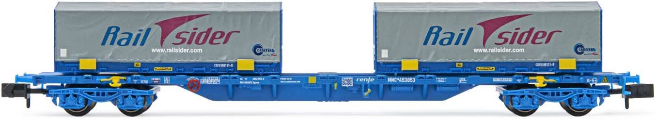 Arnold RENFE MMC loaded with two Cadfer Railsider 22' Flatrack Containers with Grey Tarpaulin period VI