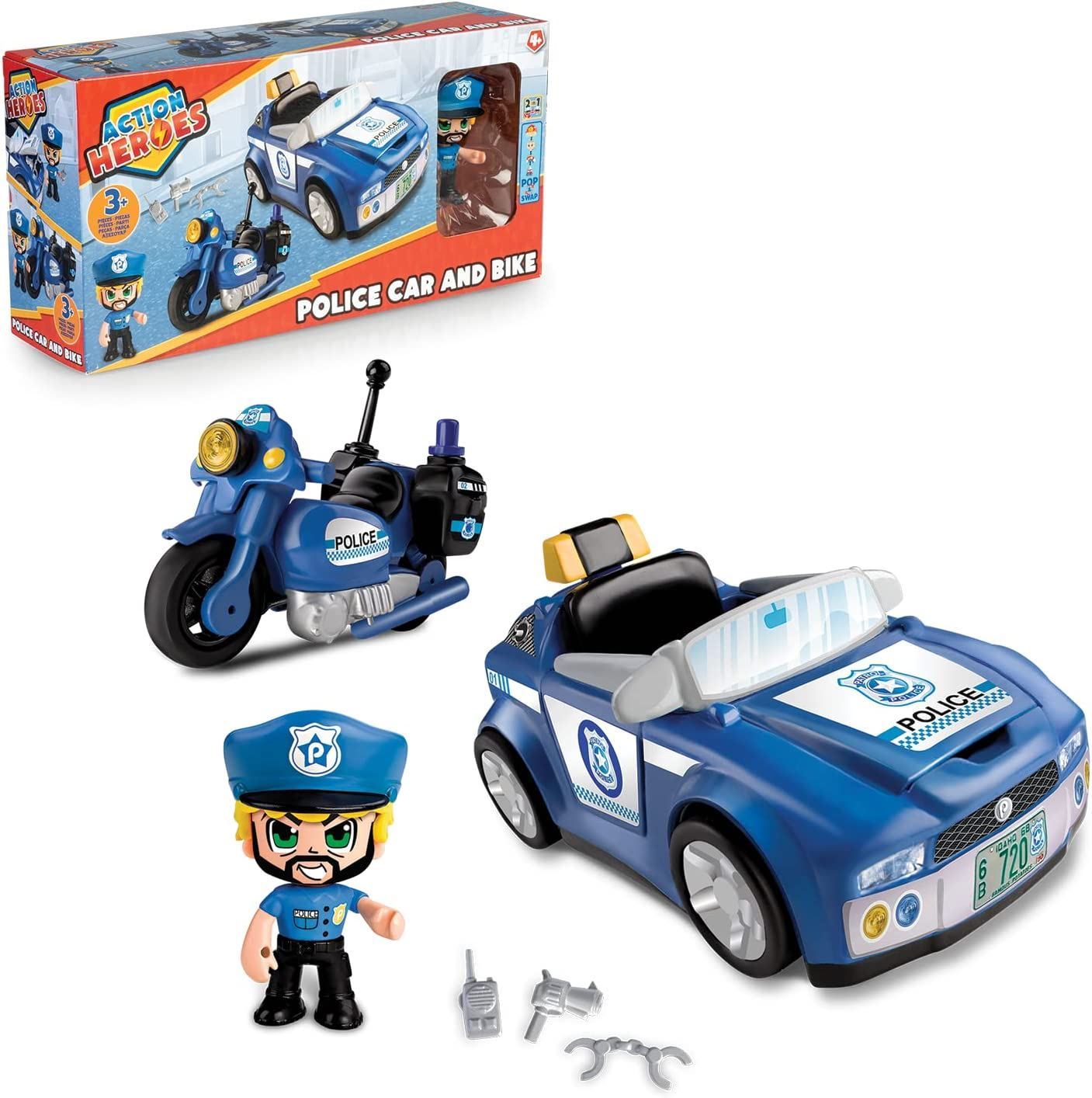 Action Heroes Police Car and Bike is the best set to chase the bad guys on the road! The Policeman will have the chance to choose between car and motorcycle depending to what call he's attending. To attend calls between cities, he'll hop on his superfast,