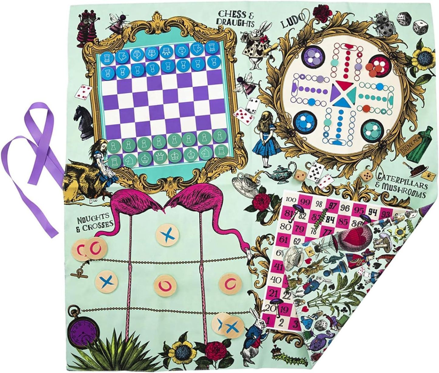 Alice�s Party Games Mat - Alice in Wonderland Themed games mat with 5 classic family games. Play Chess, Pachisi / Ludo, Tic Tac Toe / Noughts & Crosses, Checkers / Draughts and Snakes & Ladders on one side, then flip it over for a game of Spot the character with a twist on the other! Set contains games mat, 9 wooden counters, 2 wooden dice, 32 chess pieces, 16 ludo counters and instructions.