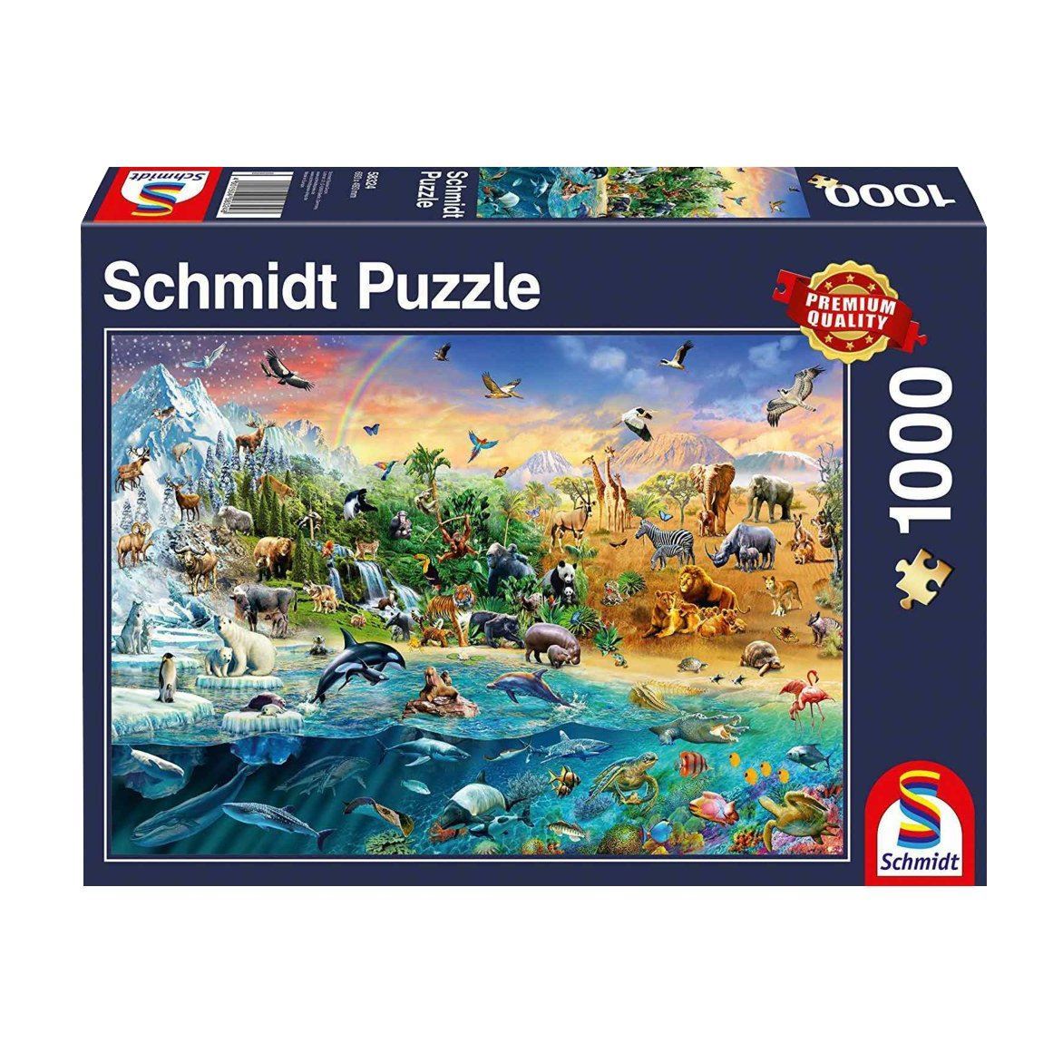 Schmidt six star premium quality 1, 000 piece jigsaw puzzle. Snug fitting, varied, extra thick and smooth edged pieces. Features a beautiful image of some of your favourite animals from across the planet. A perfect gift for any puzzler. The completed puzzle measures approximately 69 cm x 49 cm.