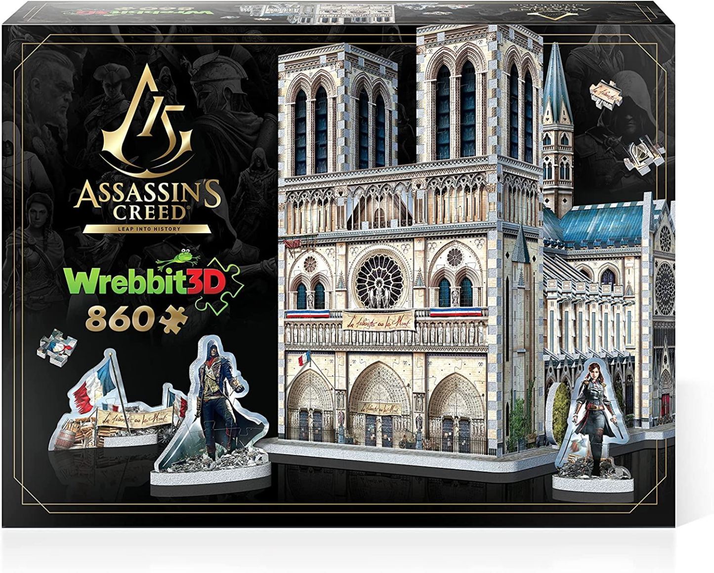 Jump out of your haystack! Time to climb to a new vantage point and rediscover one of the most iconic locations found in the Assassin?? Creed franchise: Notre-Dame. Parkour your way piece by piece and explore this historical building filled with NPCs and items from Assassin?? Creed ??Unity. Complete with self-standing props of the main characters Arno Victor Dorian and Elise de la Serre, this unique 3D puzzle will be the centerpiece of your collection. Assassin?? Creed Unity - Notre-Dame is a challenging project which all puzzle lovers 14 years old and up will want to carry out either on their own or with friends and family members. Great gift for Assassin?? Creed fans, men, women and teens alike. Once your project is completed, your stunning accomplishment will be proudly displayed in your home. Take puzzles to new heights and go 3D! Build your own Assassin?? Creed Unity - Notre-Dame Cathedral Wrebbit3D puzzle in 3 easy steps: SORT the pieces by shapes and colors, ASSEMBLE all the flat sections and GO 3D following the illustrated assembly booklet included in English, French and Spanish. Includes 860 puzzle pieces, each backed with ??inch of foam for a sturdy, impressive 3D model. ??ow to??videos and additional color instructions available through Wrebbit3D?? website. Free replacement of missing or lost pieces also offered through Wrebbit3D?? state of the art online customer service. With assembled dimensions of 22 x 10 x 14.5 inches and stunning graphics and illustrations, it will make quite an impression with friends and family members. All Wrebbit3D puzzles are made in Canada using a unique foam backing technology providing snug and tight-fitting pieces that are easy to handle. They do not require any glue for their assembly. They are the sturdiest 3D jigsaw puzzles on the market with the highest quality of design and illustration. Wrebbit3D puzzles are the world?? only first original 3D jigsaw puzzles, not to be confused with construction kits or model kits, making them the only ones delivering THE REAL 3D PUZZLE EXPERIENCE.