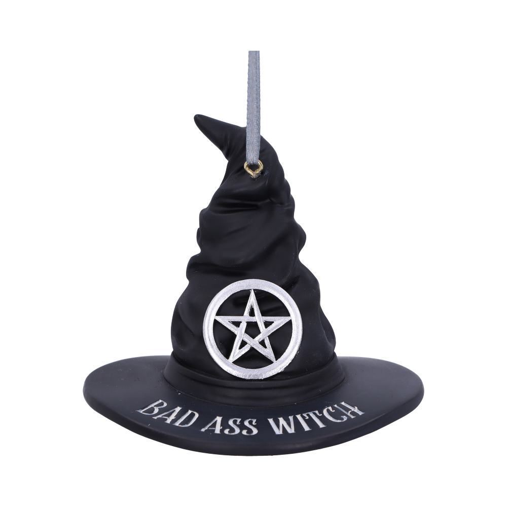 From the bewitching minds of Nemesis Now's in-house design team comes this witches hat hanging ornament. Featuring a silver pentagram on the centre of the ornament and the words 'Bad Ass Witch' on the brim of the hat. Cast in the finest resin before being expertly hand-painted, this hanging ornament is a must-have addition to any alternative home or gothic collection.