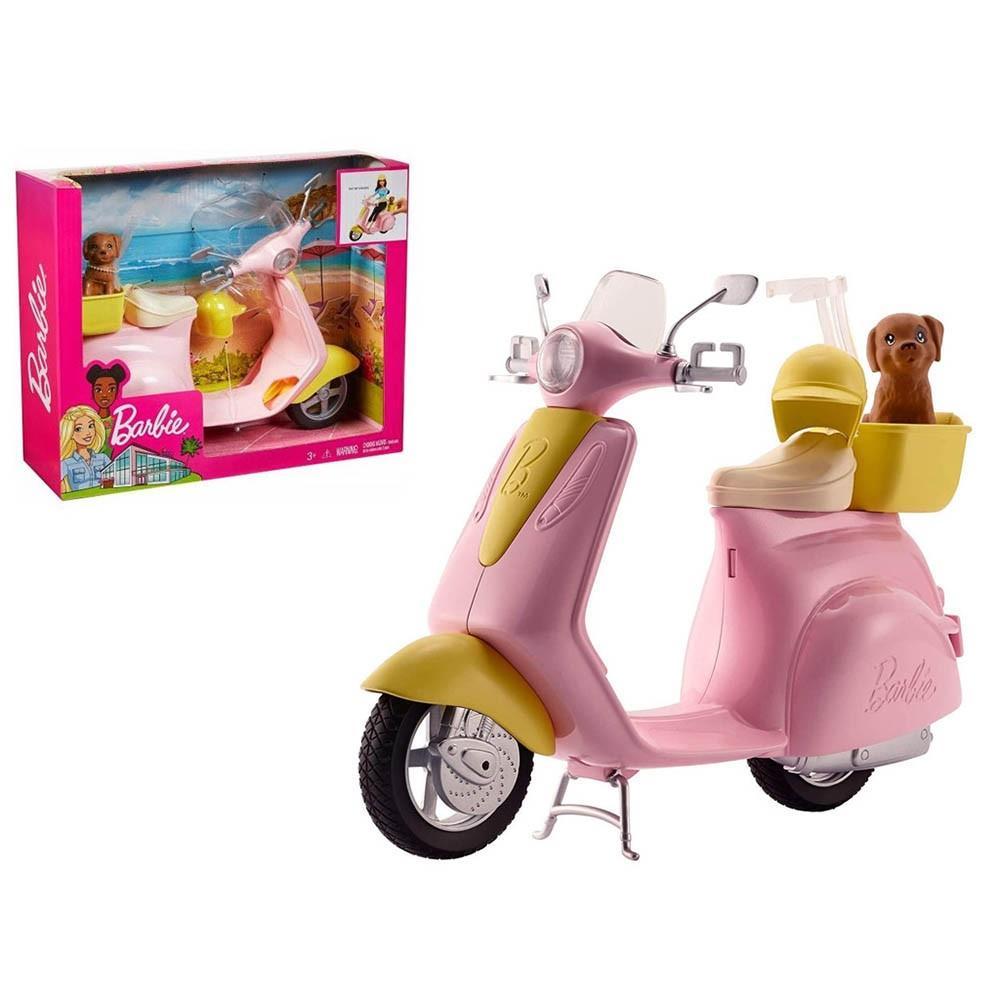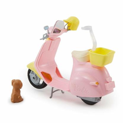 Scoot into fun with this Barbie moped. It comes with a pet friend who’s always ready to ride! designed in pink and yellow with silvery accents, the moped is trendy and stylish. Place the Barbie doll (sold separately) on the seat where a clip holds her in place. Lift up the kickstand and push to head into imagination. Bring along the puppy in the yellow basket on the back. And a yellow helmet for a Barbie doll lets her ride safely in style. Whether you are going for a short ride or driving into adventure, this moped is ready to roll! includes Barbie moped with basket, puppy, and helmet; doll not included.