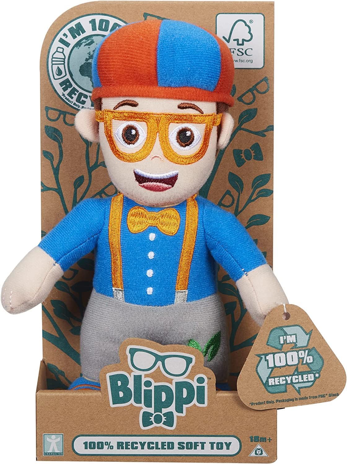 Supersoft and cuddly plush. Classic Blippi styling. Made from 100% Recycled materials including fabric, filling and thread. Packaging made from environmentally responsible FSC materials.