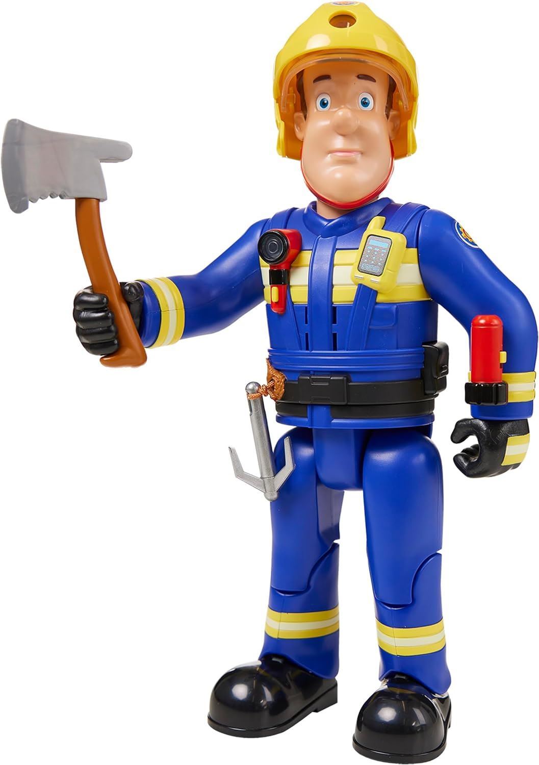 LARGE ARTICULATED ACTION FIGURE- Ultimate Sam stands at 12� Tall, and is packed with fun features. The ideal gift Fireman Sam Fans, and perfect for encouraging imaginative play. WORKING HELMET VISOR WITH DAY & NIGHT VISION- Want to see what Sam sees? Then simply look through the hole in Sam�s helmet to see in normal or night vision. Just raise or lower the safety visor to change between night and day effect. WITH WORKING ARM TORCH, RADIO WITH SFX, AND MORSE LIGHT- Switch the torch on Sam�s arm on and off to activate. Press the button on the Radio on Sam�s chest, to hear Sam speak and receive emergency calls. Then, use the built in L.E.D Morse code signal light to transit messages! ACTION ARM WITH GRIPPING HAND- Use the gripping hand to hold Sam�s fir axe accessory, and press the button on Sam�s waist in and out to make Sam�s arm move up and down. CLIMBING ROPE WITH BUILT IN WINDING WHEEL- Sam even has a handy grapple hook to help him access hard to reach spots! Use the built in winding wheel on his belt to extend and retract the rope with grapple hook attached.