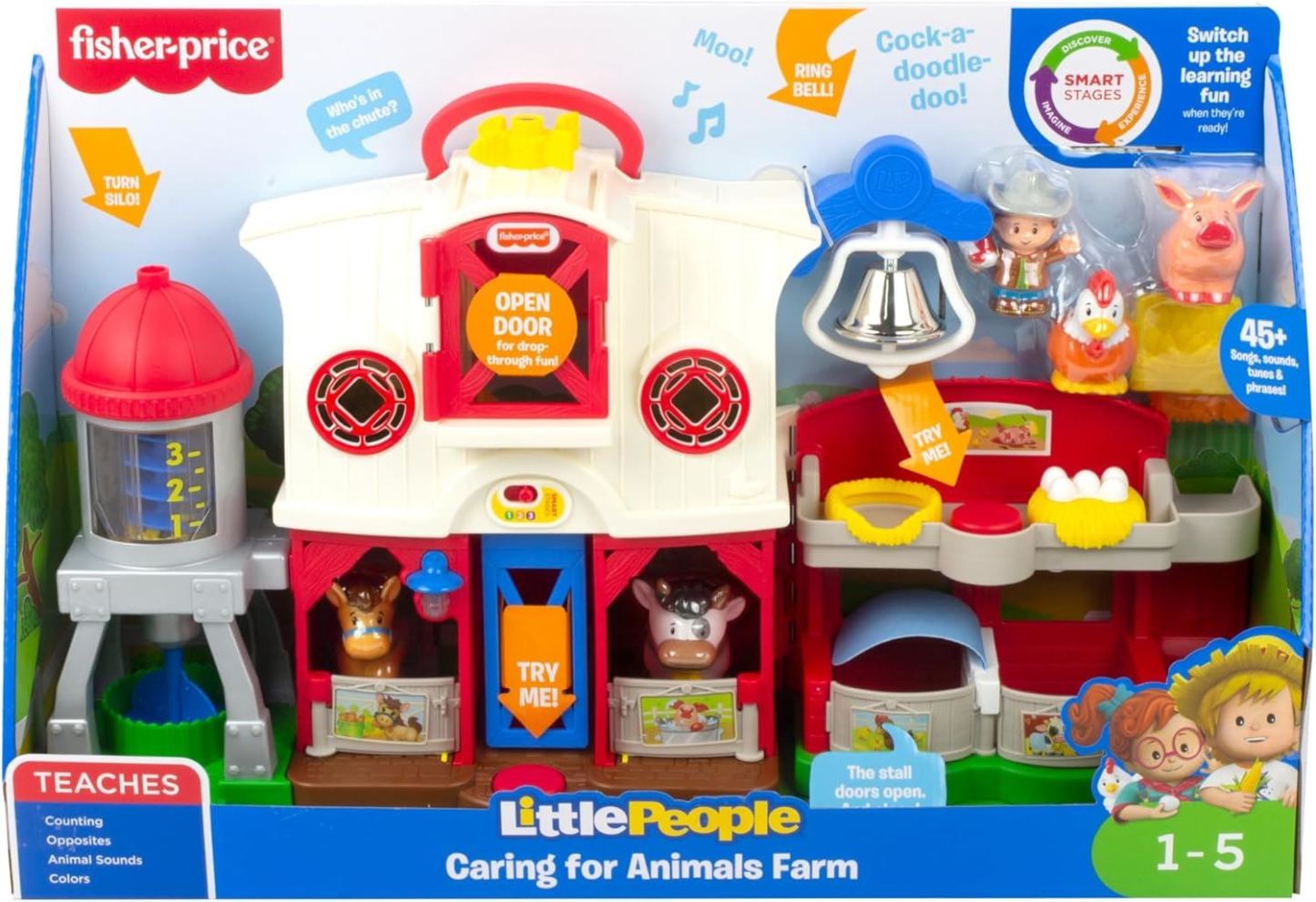 INTERACTIVE ELECTRONIC FARM SET FOR 1 YEAR OLDS - Discover a whole world of farm fun with Fisher-Price Animal Farm Toys! Our play figure playsets include all of your child's favourite farm animals and all kinds of ways to play with them! Including 1 farmer figure, 4 animal figures and 2 food play pieces, along with 45+ songs, sounds and phrases that bring them to life! ENDLESS TOY FARM PLAY SETS FUN - There's so many different ways to enjoy our toy farm set! Toddlers and preschool kids ages 1-5 can press the buttons on our animal toys for 1 year olds for sounds, lights and actions like hatching chicks, tucking in the horse for its nap, showing the pig and cow how to take turns and 'pop' the corn in the spinning silo. SMART STAGES TOYS FOR 1 YEAR OLD BOYS AND GIRLS - These farm-themed 1 year old toys ensure playtime grows with your little farmer! Each farm yard set is equipped with Smart Stages technology that has learning content that changes with your child's age and stage. Our toddler farm set has variety of developmentally appropriate media within three levels of play - Discover, Imagine and Experience.