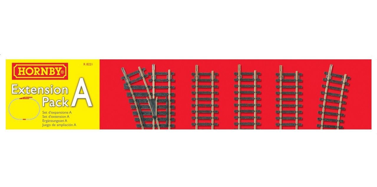 Extend your set in easy steps by adding Track Packs and TrakMat Accessory Packs all the way to the full layout pictured on your TrakMat scenic underlay sheet. Add Extension Pack A to the Starter Oval supplied with the smaller Hornby train sets to make this layout.Track Extension Pack A contents: Straight track (R600) x 1; Double straight track (R601) x 2; 2nd radius curve track (R606) x 1; Left hand point (R8072) x 1; Buffer stop (R083) x 1.