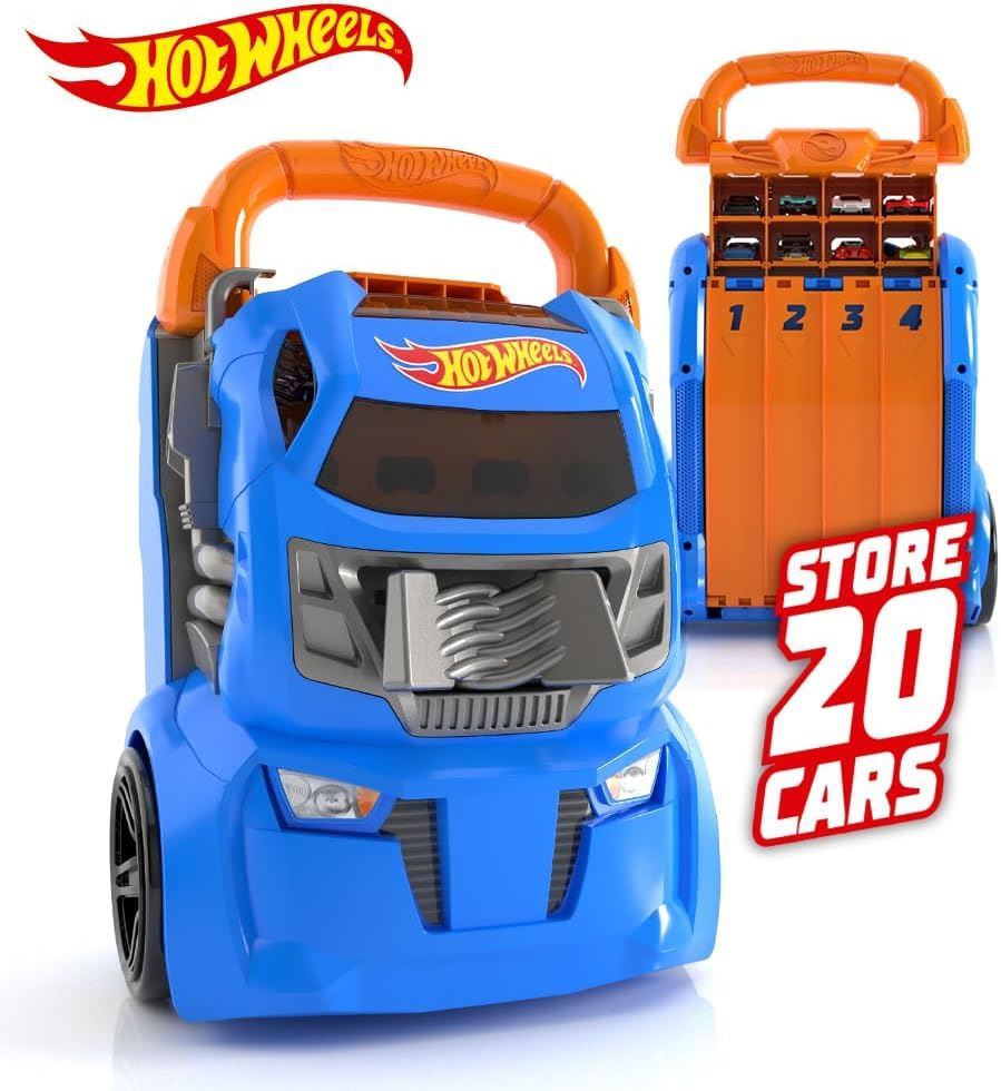 Ignite the thrill of racing with the Hot Wheels Cars Case and Launcher � the ultimate storage solution and race track all in one! This dynamic case is designed with iconic Hot Wheels aesthetics, showcasing the signature flames and vibrant colours that define the world of high-speed adventures. Store up to 20 of your favourite Hot Wheels cars securely and, with the built-in launcher ramp, launch four cars at a time for head-to-head races that will leave you on the edge of your seat. Unleash the power of Hot Wheels and take your collection to new heights with this exhilarating and portable racing experience!