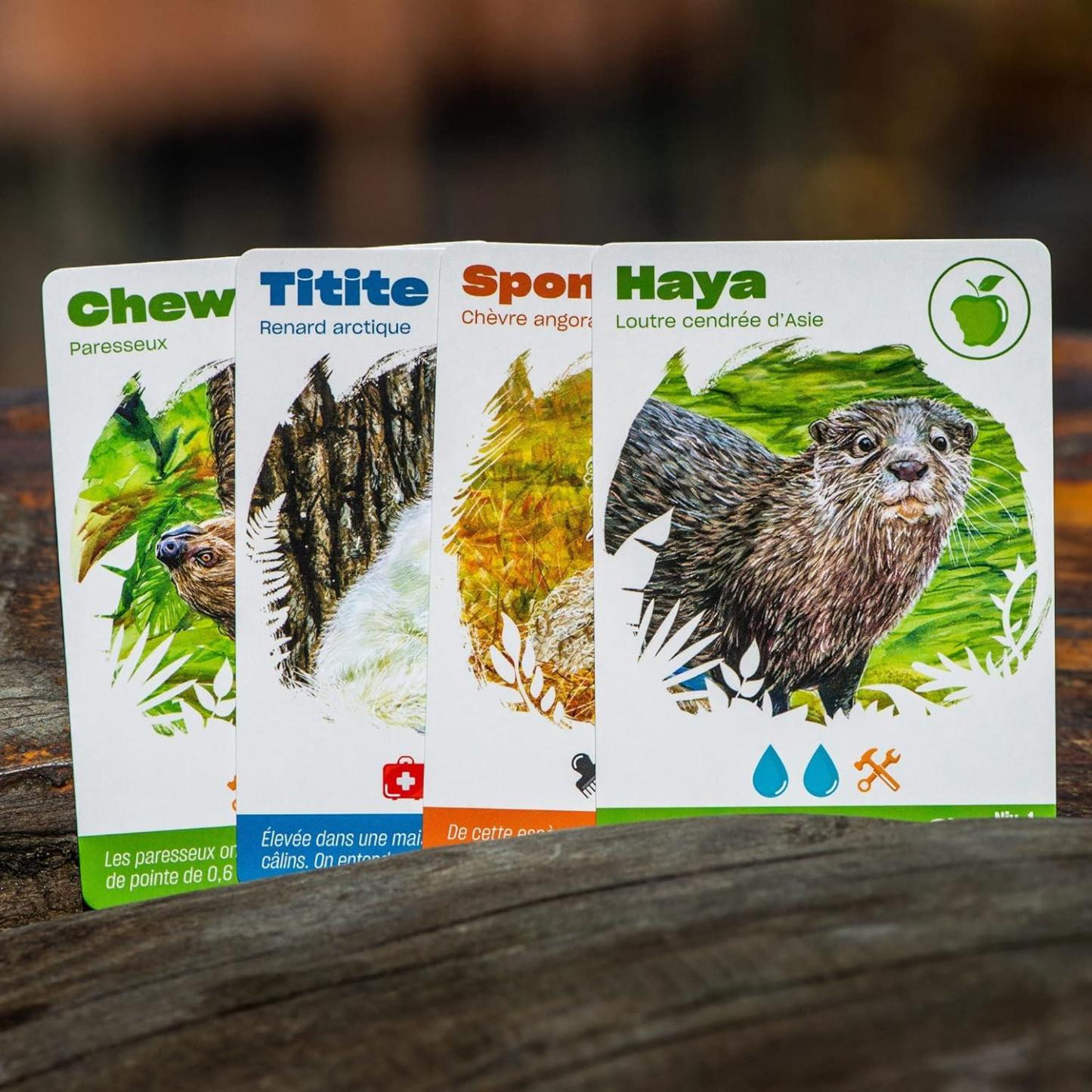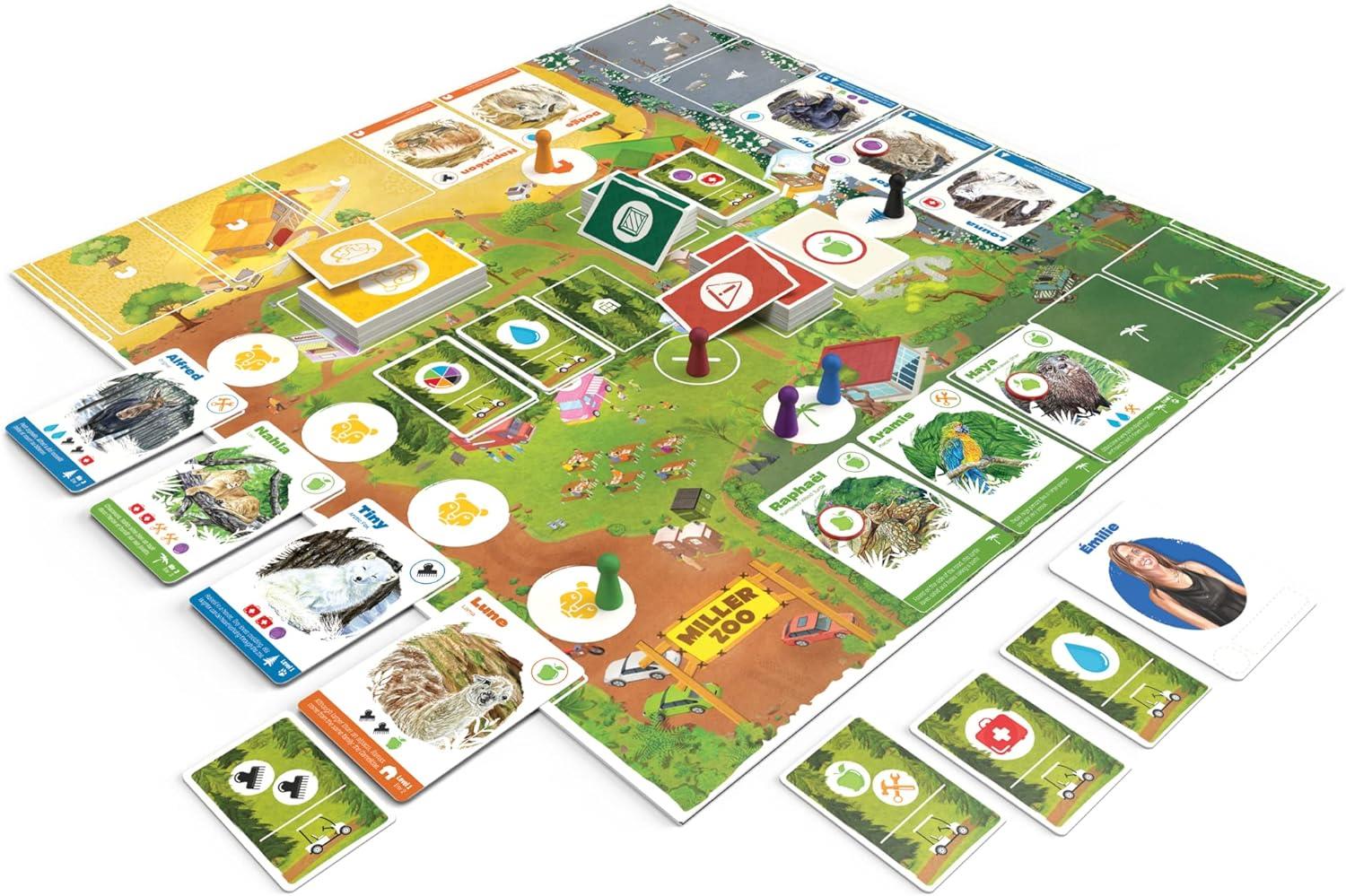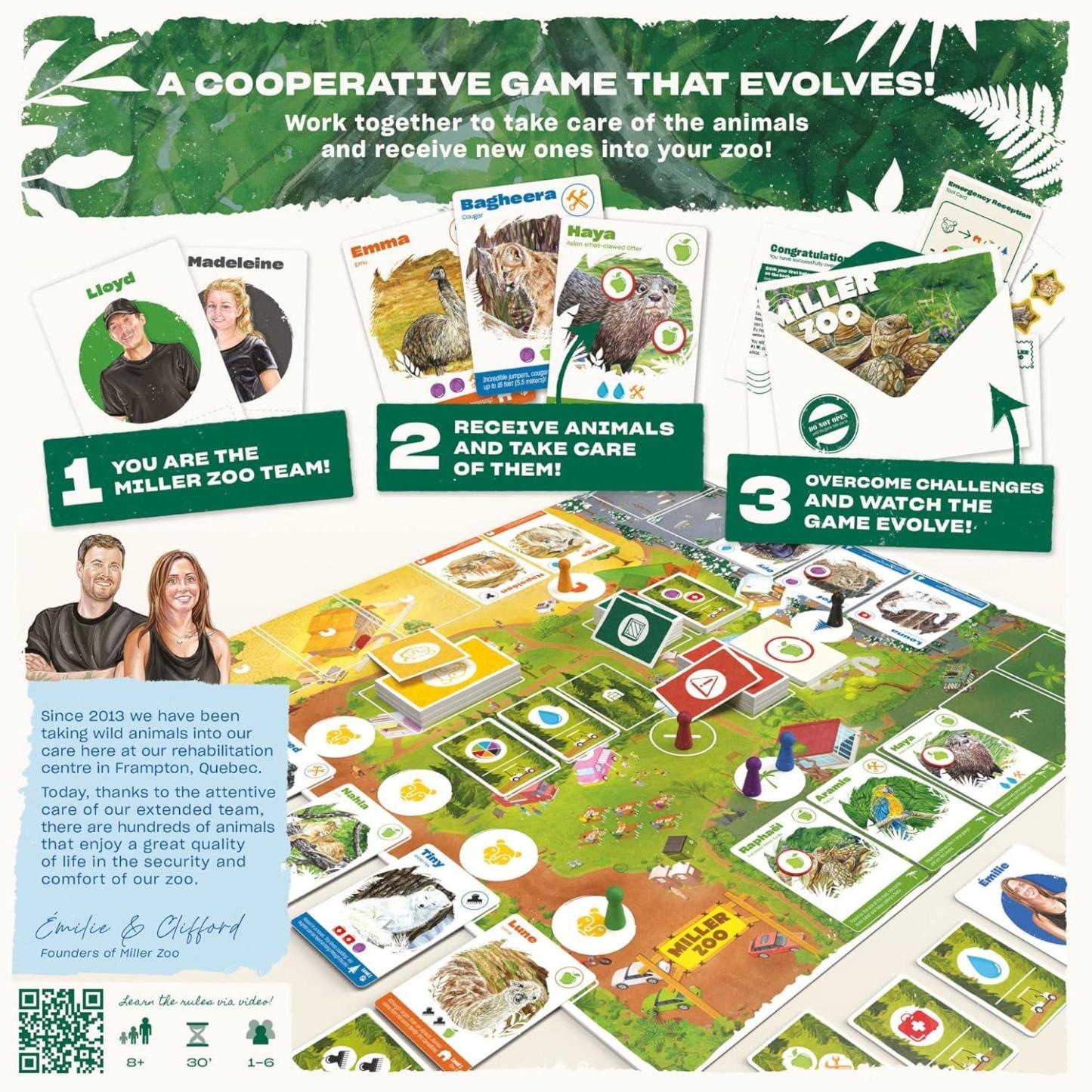 Miller Zoo is THE cooperative family game where you play as the team in charge of running one of Canadas most interesting zoos! Your job is to work together to take care of your zoos animals, and to welcome new ones to their new home. Like a team, everyone plays together at the same time to overcome challenges, unexpected situations, and crises. Play as the real Miller Zoo team and meet all the animal's needs before the card stack is empty. A game follows 4 steps in order: dawn, morning, afternoon, and evening.