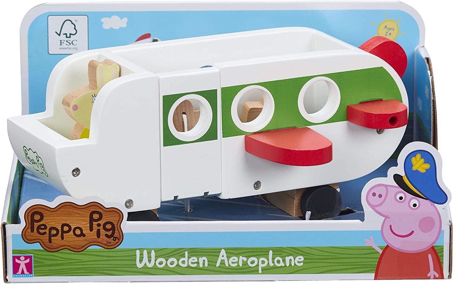 Peppa Pig push along wooden aeroplane with enough space for four wooden Peppa Pig figures and two wooden suitcases. Includes 1 wooden Miss Rabbit figure with drop and play feet it can be easily slotted into any Peppa Pig wooden vehicle or playset. Made from environmentally responsible FSC wood. Chunky, durable and suitable for little hands. Encourages fine-motor skills, hand-eye coordination and imaginative play.
