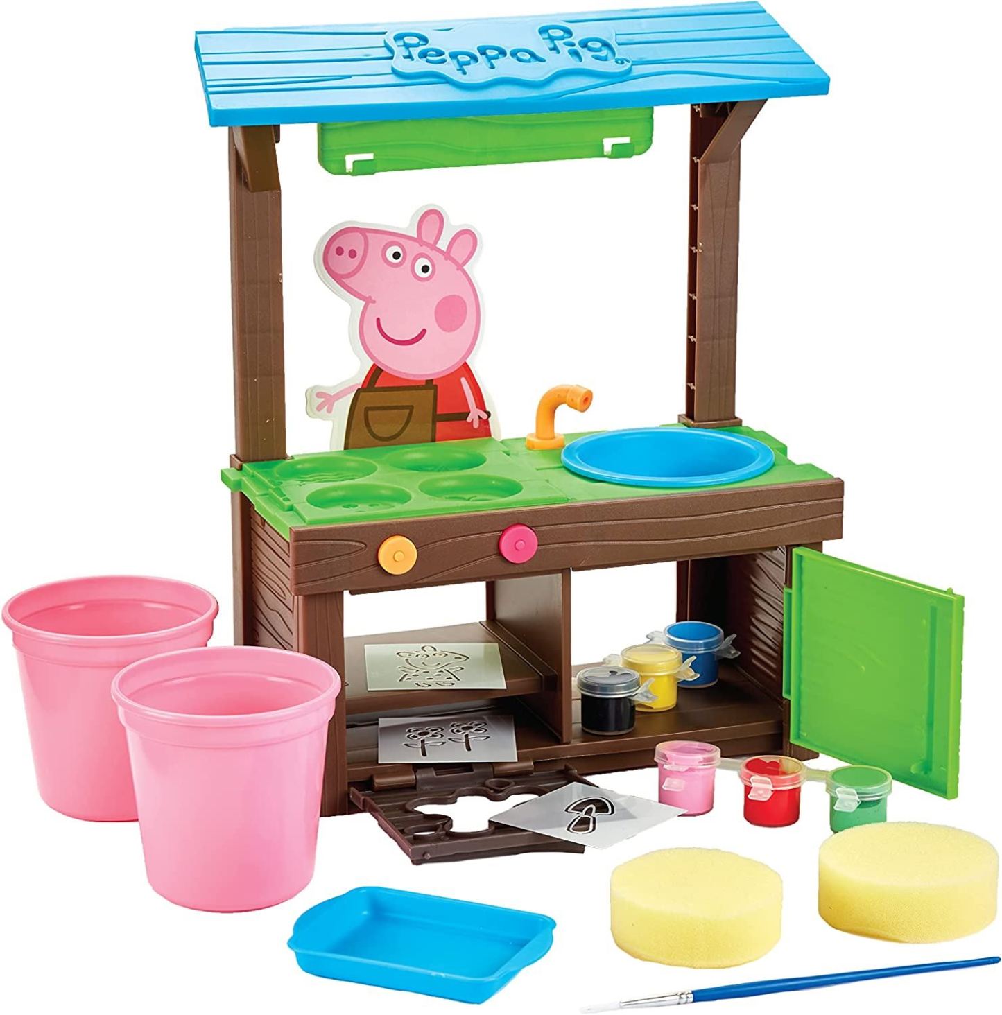 CREATE YOUR OWN GARDEN CRAFTS- This cute kitchen features authentic Peppa Pig Styling and is the perfect size for table top craft time for children aged 3+. DISCOVER FUN FEATURES- With opening cupboard doors and shelves for safe storage. There's even a paint brush holder. Fill the pretend sink with water to wash your brush. LOTS OF ACCESSORIES INCLUDED- There's 6 different colours of paint, and paint brush, sponges, 1 tray, 1 sink bowl, and 2 plant pots. There's even 3 stencils to use, or create your own fun design! ENCOURAGE IMAGINATIVE AND CREATIVE PLAY- This playset is great for encouraging children to make their own garden art creations. PERFECT PEPPA PIG GIFT- This items comes in a large display box and makes a perfect gift for creative Peppa Pig fans! Suitable for children aged 3 years and over.