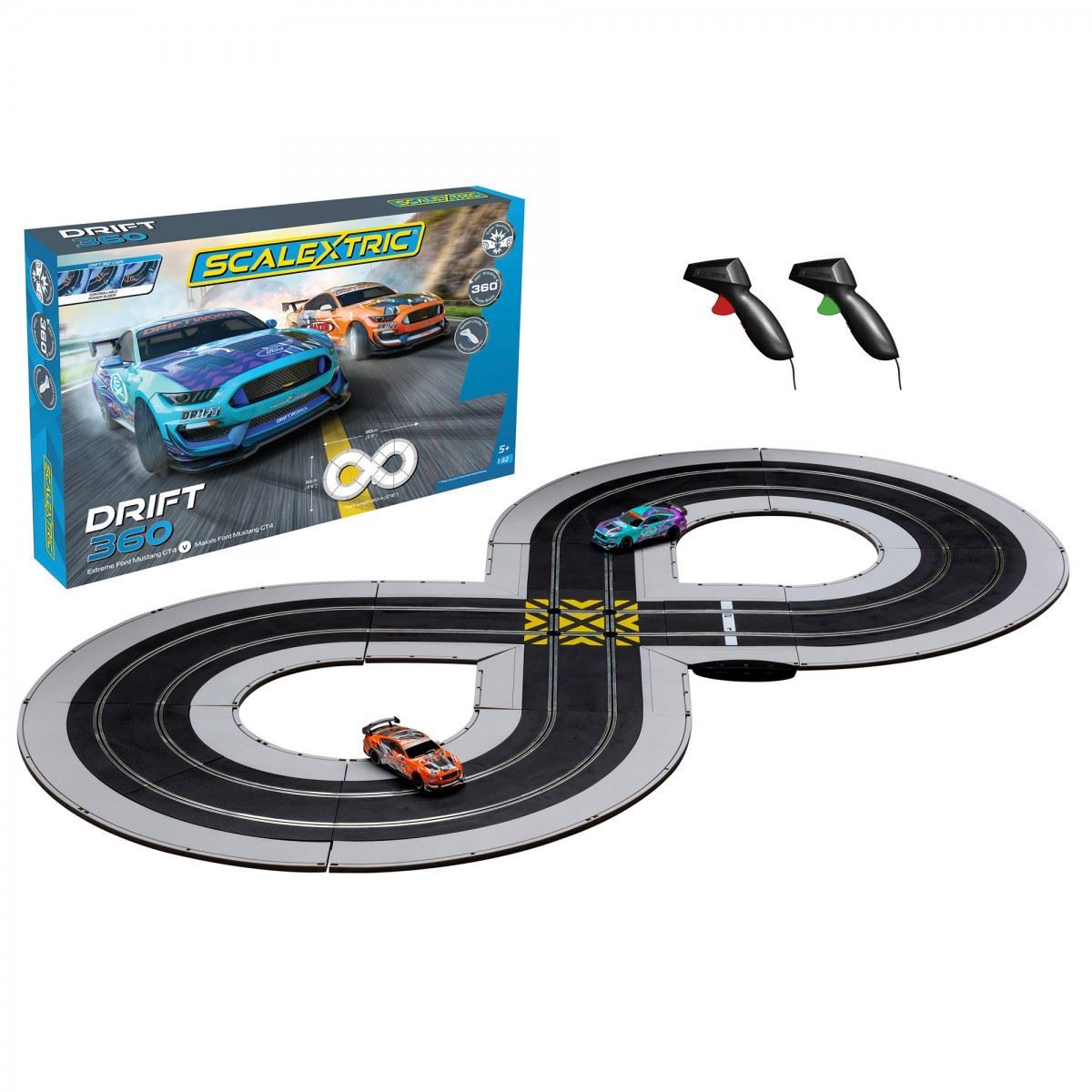 Scale: 1:32. This set has everything you need to get racing. Race two Ford Mustang GT4 cars around a figure of eight track in this Drift 360 race set. Includes two crash resistant cars with working rear lights that also feature fully swivelling guide blades that allow 360 degree movement. 3.6 metres of track complete with borders to add to the exciting drifting element of this race set.