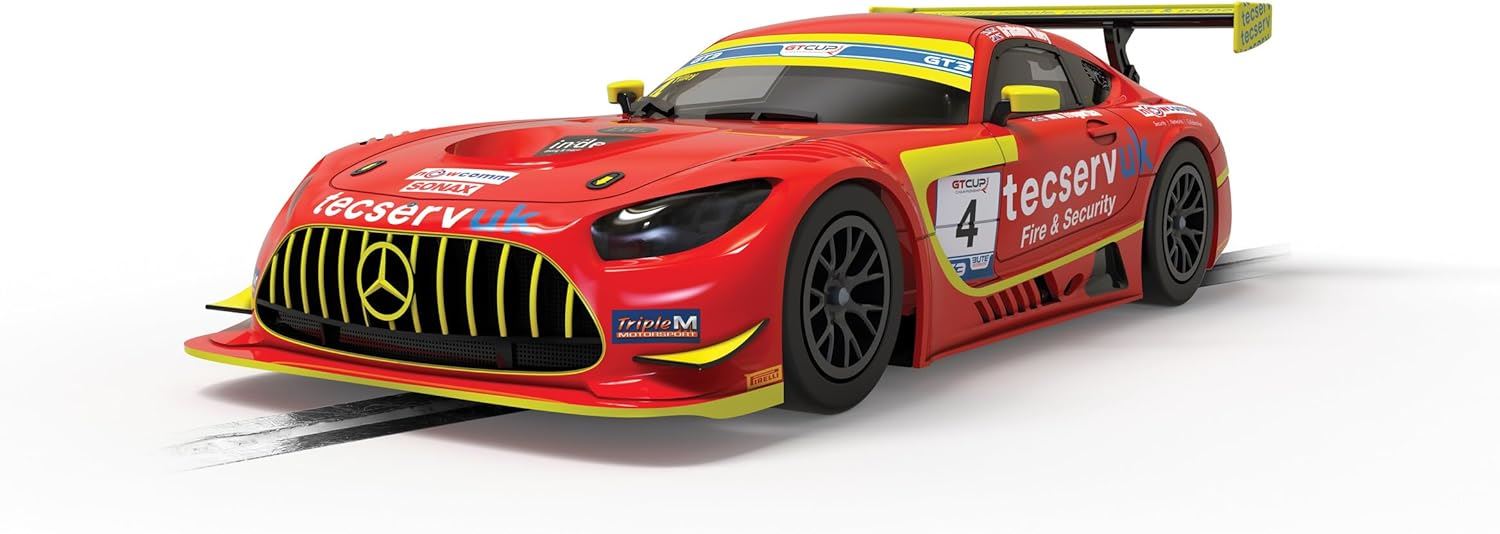 1x Mercedes Scalextric GT prototype slot cars feature top brand and top performance GT Supercars, built to compete in slot car racing. Manufacturers include Porsche, Mercedes and Aston Martin 1:32 Scale, Car with number 4 featured in race GT Cup in 2022. Compatible with Spark Plug and ARC AIR/ ARC One High Detail, Magnatraction, with working Front and Rear Lights and easy change guide blades Driver Grahame Tilley. Licenced by Mercedes-Benz and the design of the enclosed product are subject to intellectual property protection owned by Daimler AG.