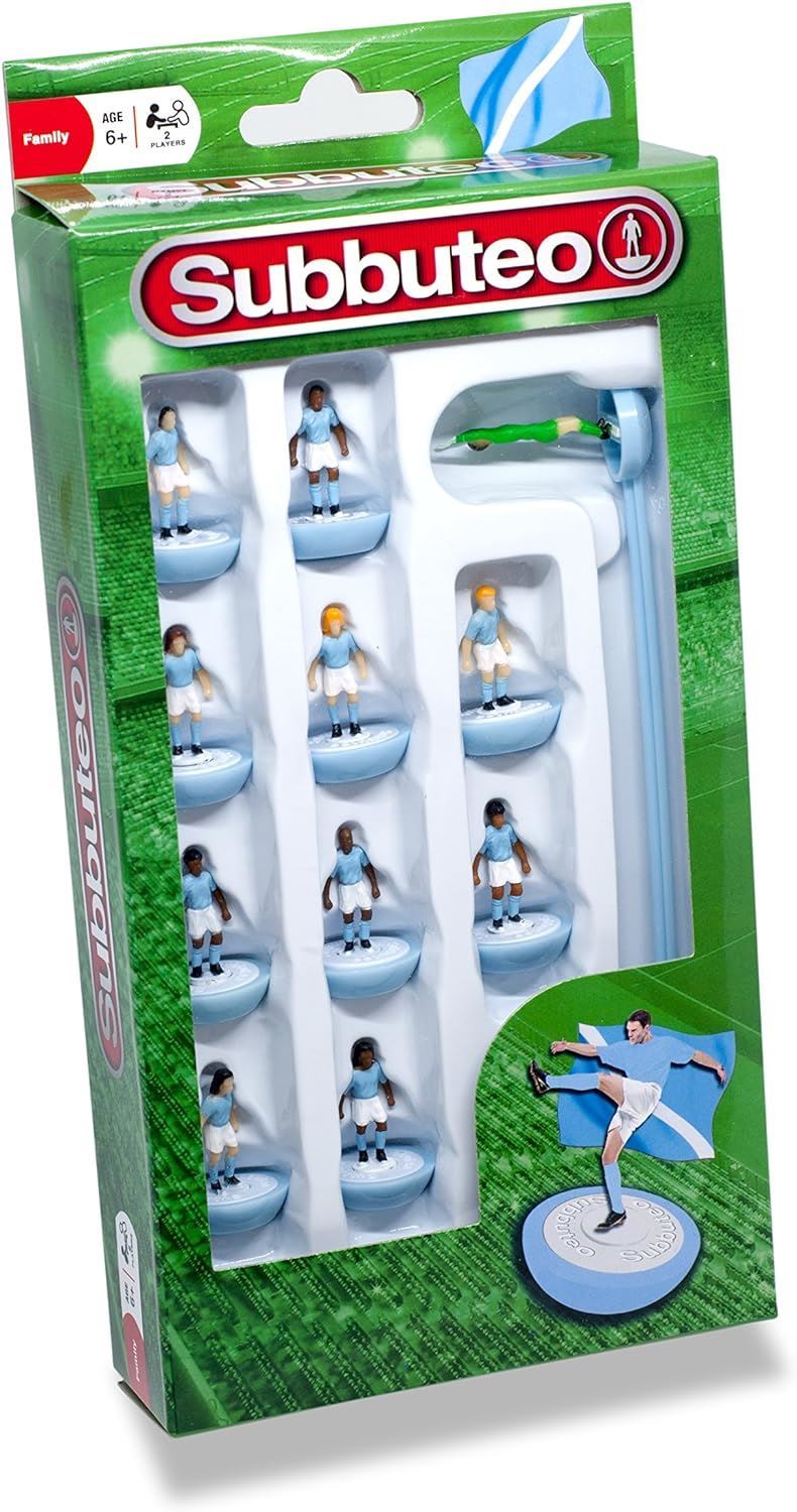The Official Subbuteo Team Player Set contains a goalkeeper and 10 Subbuteo players. Subbuteo Team Set features players wearing a light blue shirt and white shorts Perfect for fans of Football Clubs including Manchester City, Forfar Athletic and Lazio The new players are stronger, more flexible and have been produced in exceptional detail From 8 to 80, fans of all ages love the new re-energised Subbuteo range