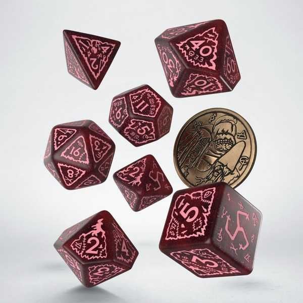The one who listens. Witness the dice set inspired by The Witcher franchise, dedicated to the Whispess ??who listened to all that occurred in the swamp. The set contains 7 dice and a metal coin. Each dice is painted shimmering-red with pink engravings. The highest value faces and the coin reverse share imagery with the ominous sigil marking; the three crones rule over the obverse.